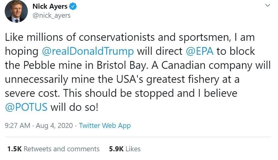 Following the signing of the Great American Outdoors Act, Ayers tweeted, “Like millions of conservationists and sportsmen, I am hoping @realDonaldTrump will direct @EPA to block the Pebble mine in Bristol Bay. A Canadian company will unnecessarily mine the USA's greatest fishery at a severe cost. This should be stopped and I believe @POTUS will do so!”